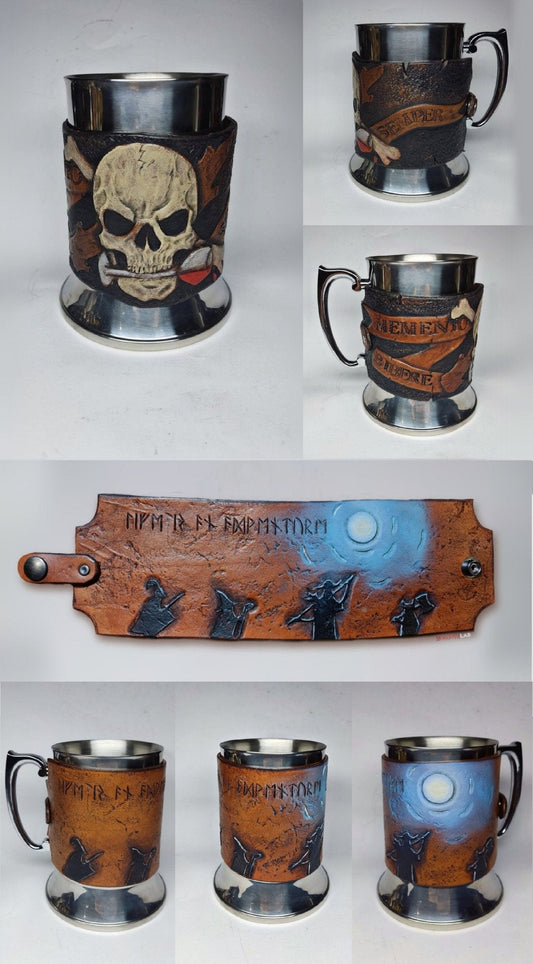 CUSTOM BEER MUG with Hand-Engraved Leather Band
